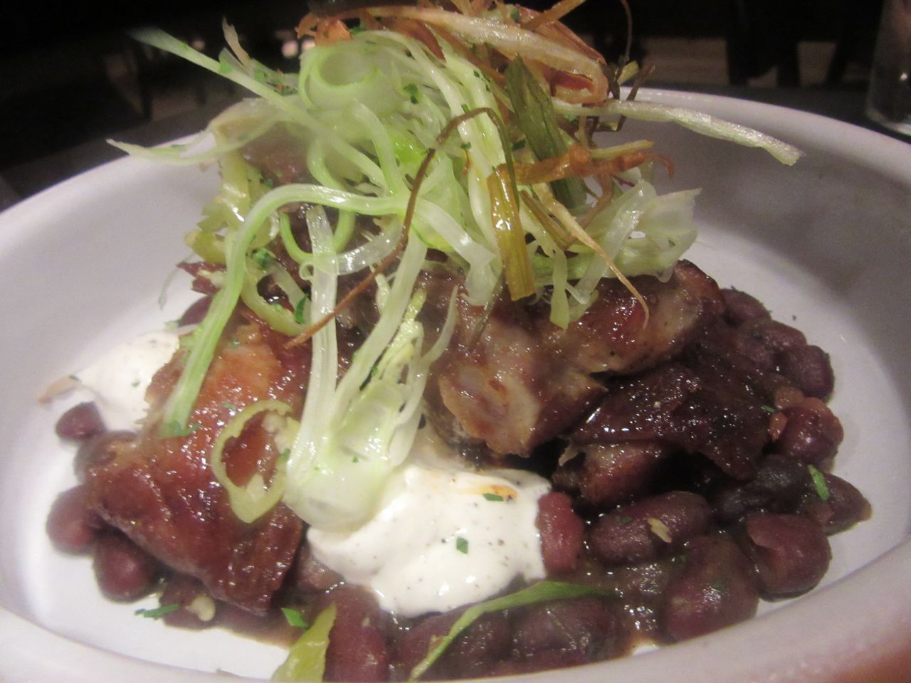 As a reward, I give them braised oxtails with chickpeas, and a cazuela of pork ribs piled atop alubias de Tolosa – meaty Basque black beans –with guindilla peppers and curls of raw fennel, both of them salty. In fact, we send back the oxtails with a complaint to our just-hatched server, who should have removed them from the check.