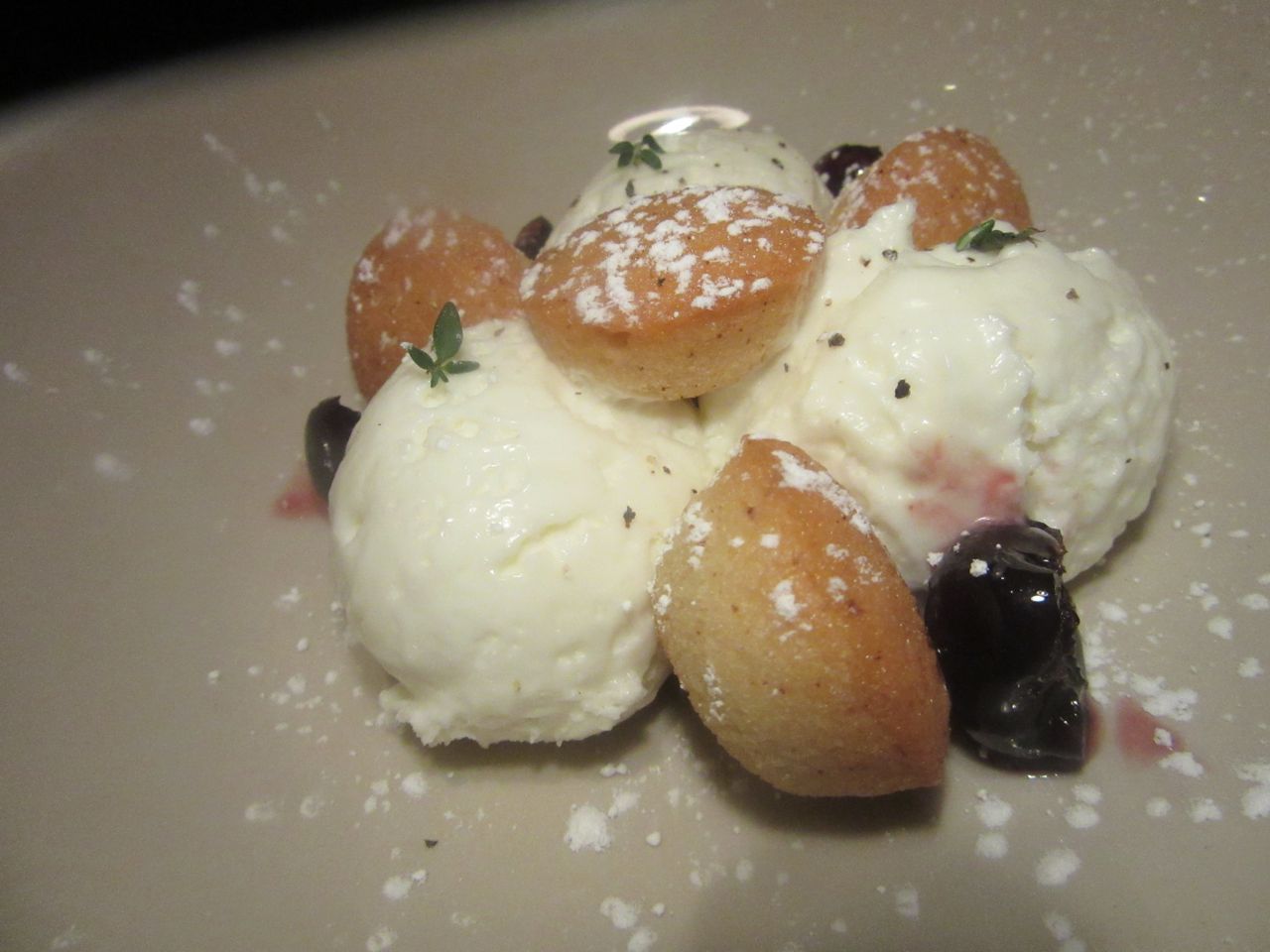 Instead, he doesn’t charge for the dessert we’ve ordered: a luscious mound of goat cheese cream, almond cake, red wine caramel, and roasted cherries.