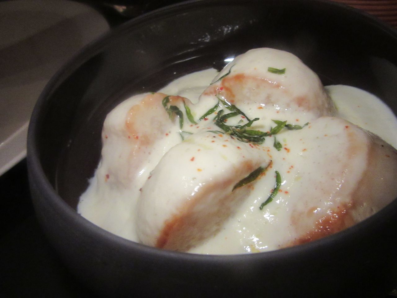 Clearly the house knows it’s me. I’d like to think that any returning enthusiast would get the same welcome, especially when the house is trying to recruit regulars. Now, they deliver a gratis scallop dish in a creamy sauce that is part of the chef’s $75 tasting: exquisitely-cooked, but too salty to eat.