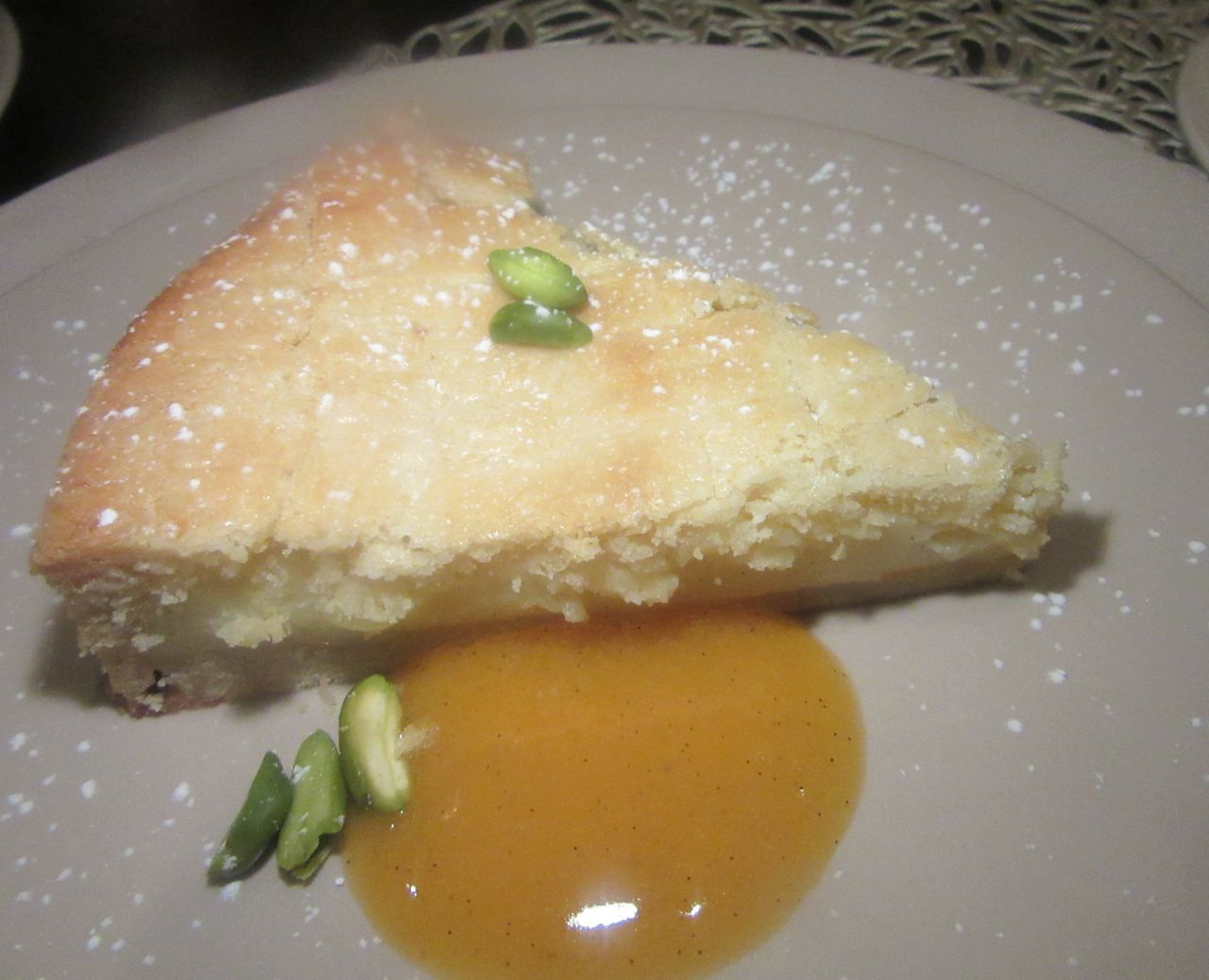 Pastel Vasco, the Basque-style custard tart, is made with apricot, olive oil and pistachio cream.