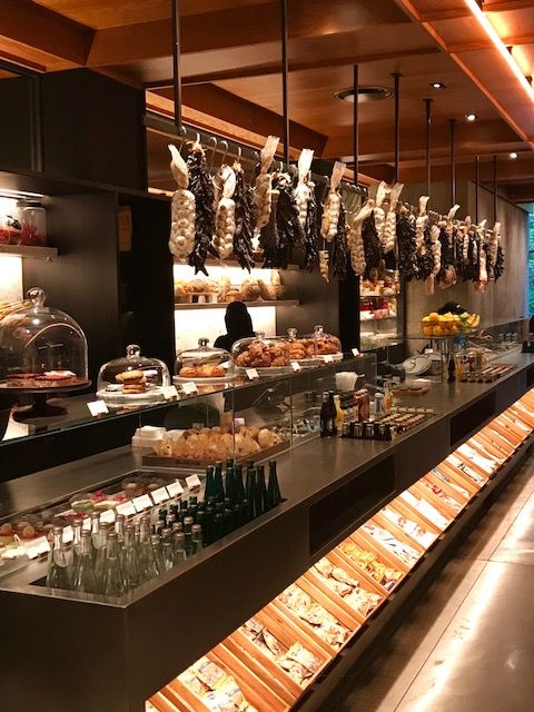 To navigate the lobby, we pass by a grand display of takeout food to carry away. Photo by Dana Stoddard.