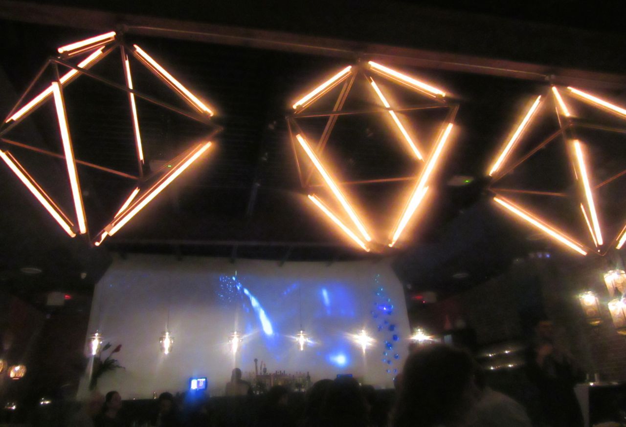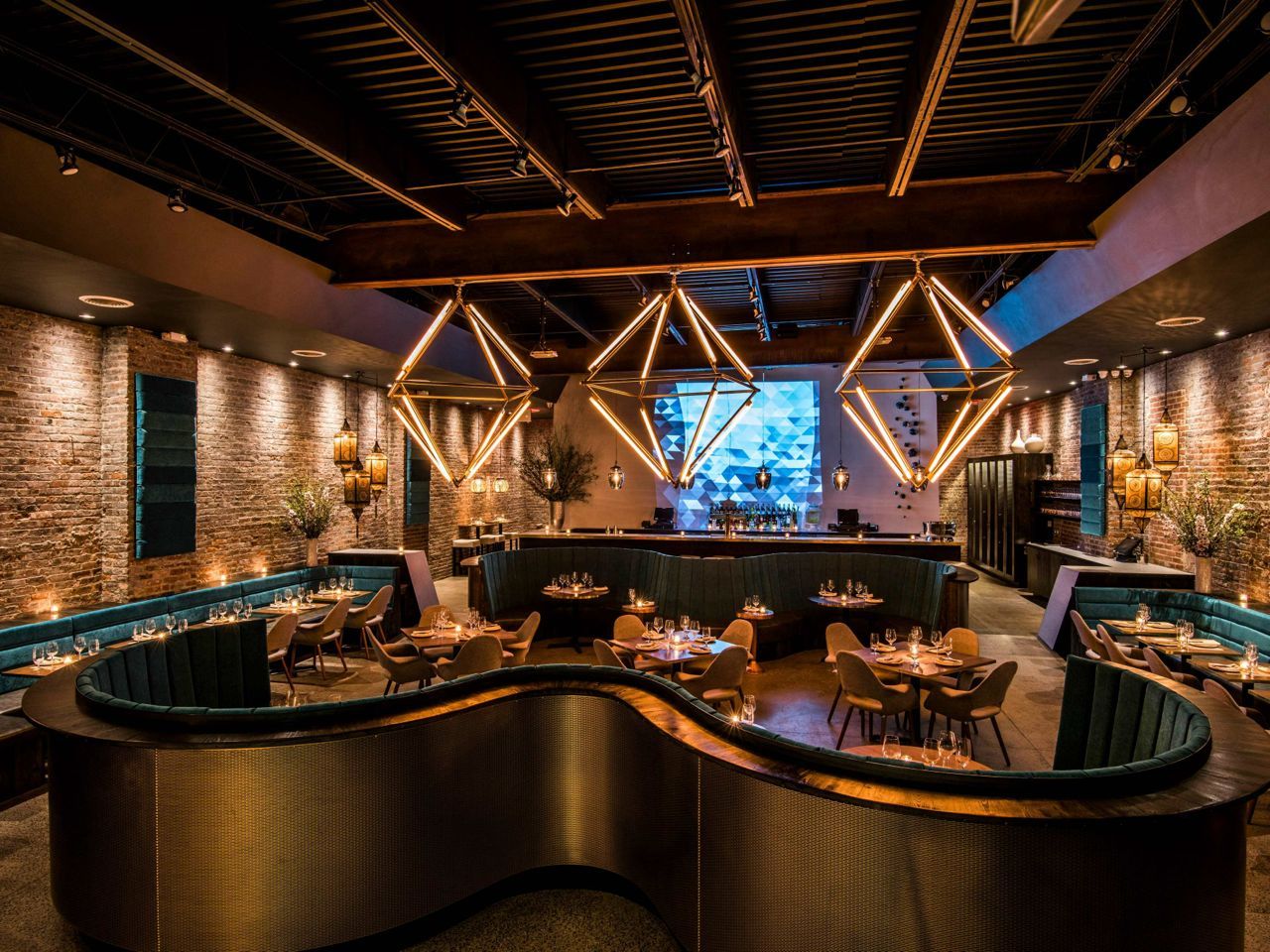 Geometric copper fixtures hang over out booth with blue glass bubbles moving on the curved walls.
