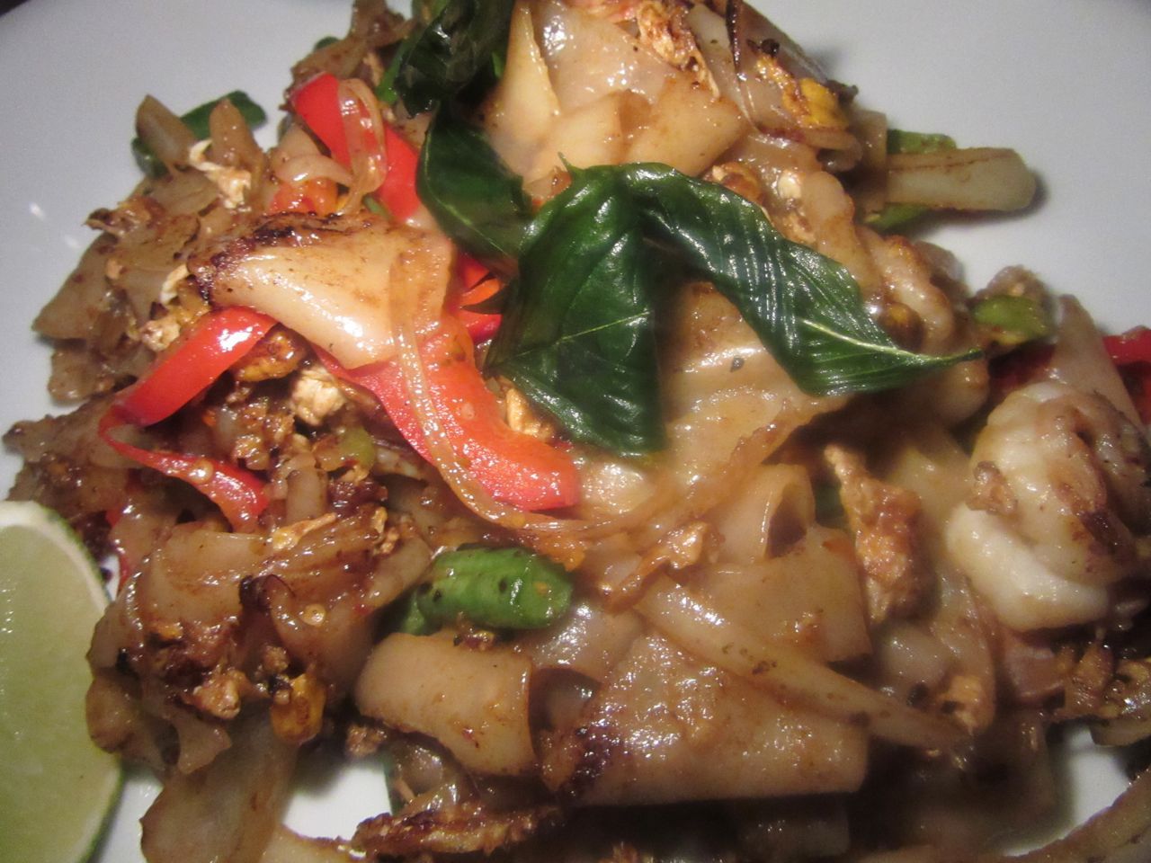 Wide rice pasta of the drunken noodles is flecked with sweet peppers, onion and fried basil leaves.