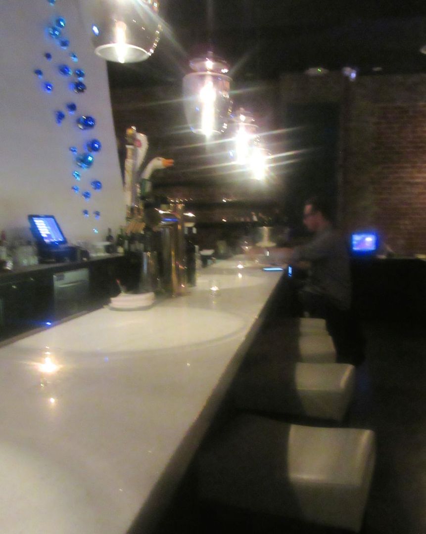 She picks me up way west on 73rd Street in a vintage red convertible. I must admit I’m already impressed. But then we pull up in front of Samui, across from the Brooklyn Navy Yard.  It’s a knockout. I stand mesmerized by the giant circus façade, flashing red, then royal blue, then purple, then green. Inside, there are three giant geometric copper chandeliers and hand-blown blue glass barnacles crawl on the curved white wall behind the bar. It’s bigger and grander than I could have expected.
