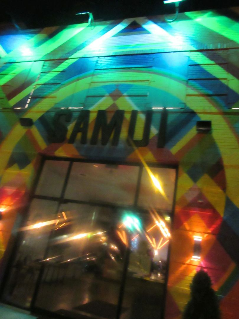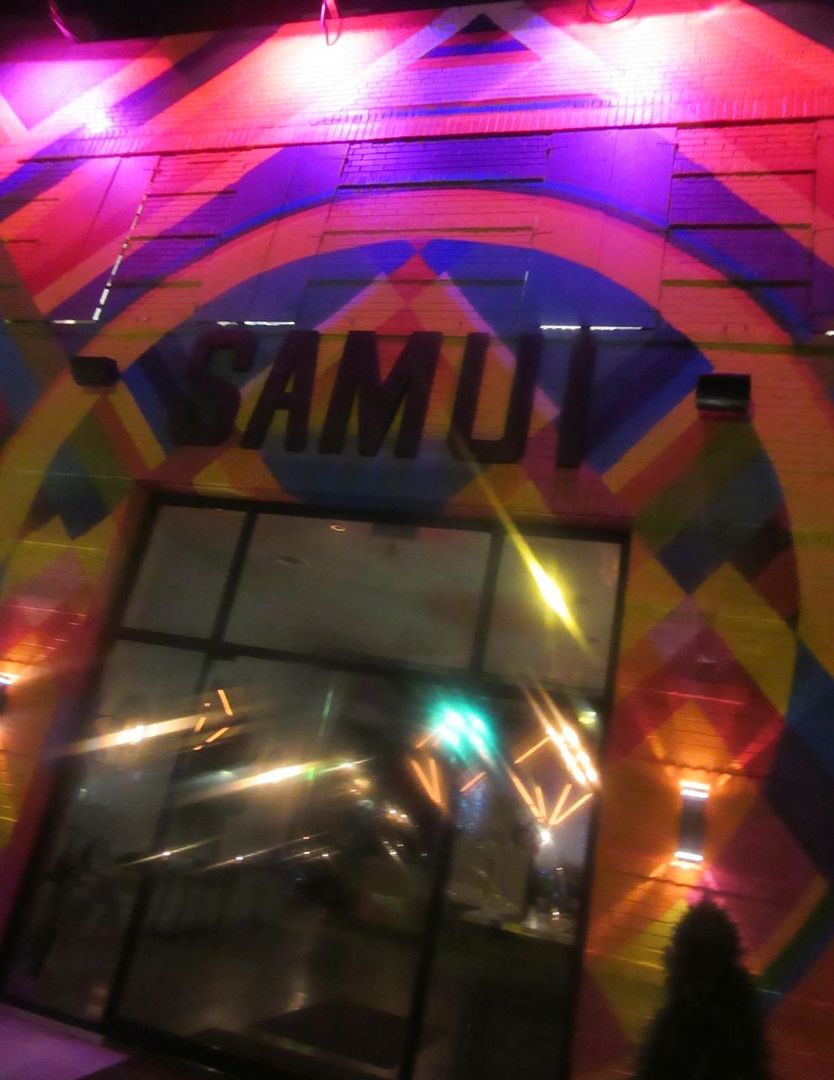 I stand outside, mesmerized by the flashing rainbow of lights on the façade of Samui.