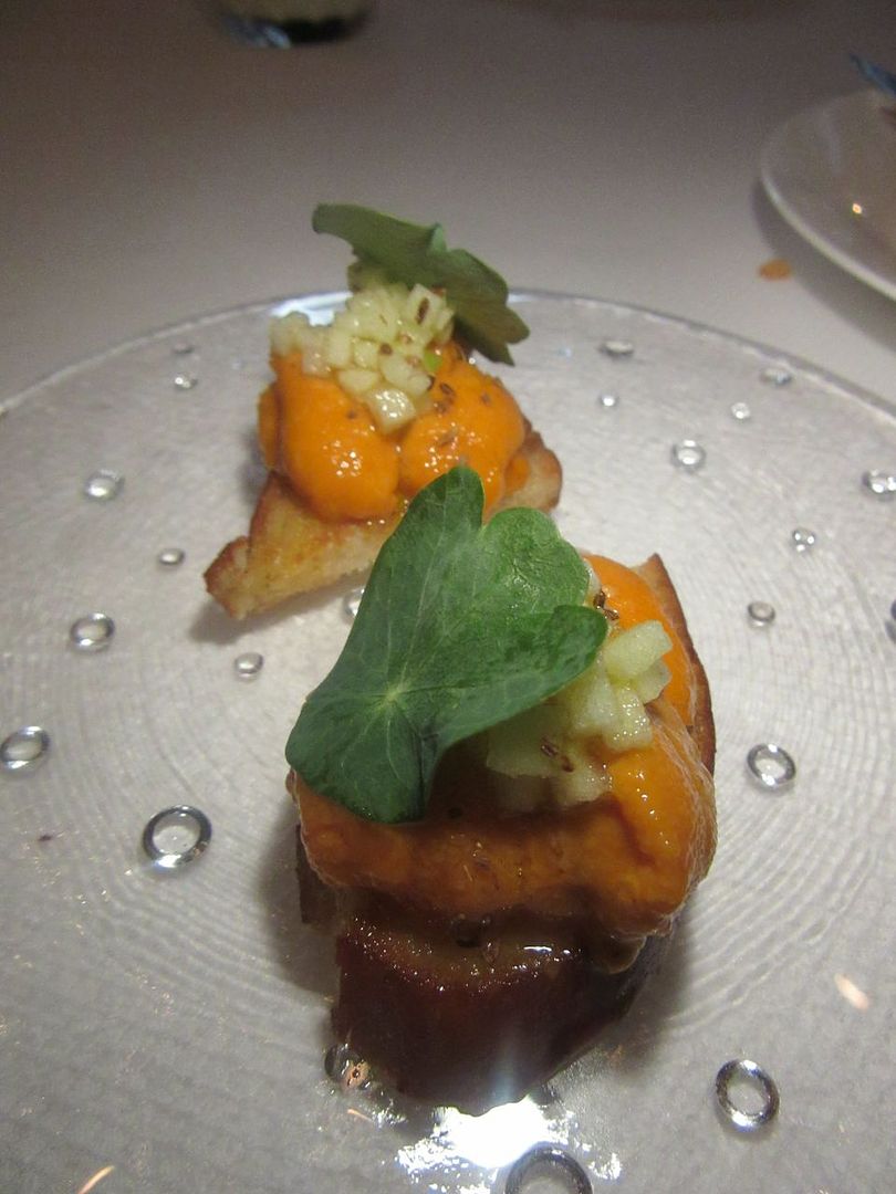 Sea urchin toasts, grilled octopus, exquisitely perfect turbot or the rack of lamb with scallops surf’n’turf definitely please me. The gathering of Santa Barbara uni on pretzel bread might seem teasingly runty. But note the pretty lush pile-up (more generous the first night, less so the second) under a sprinkle of apple bits. Will my companions sue me if I finish both halves without sharing?