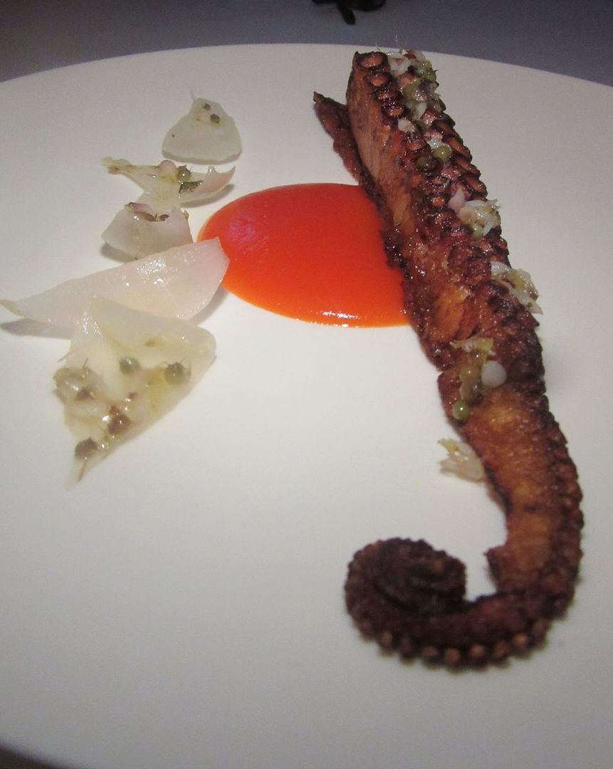 Octopus fans will like this charred appendage with onion bossoms and sweet pepper.
