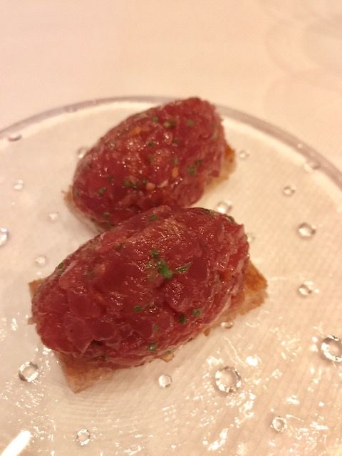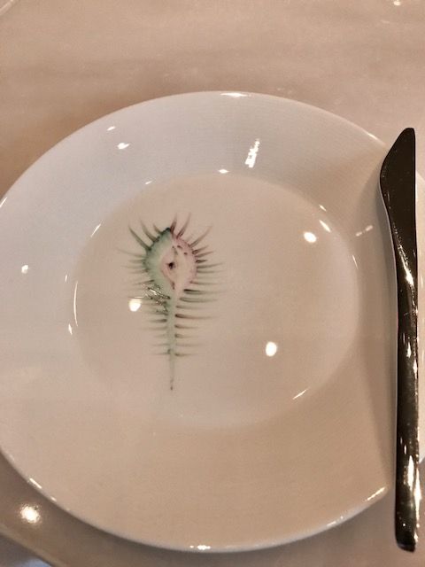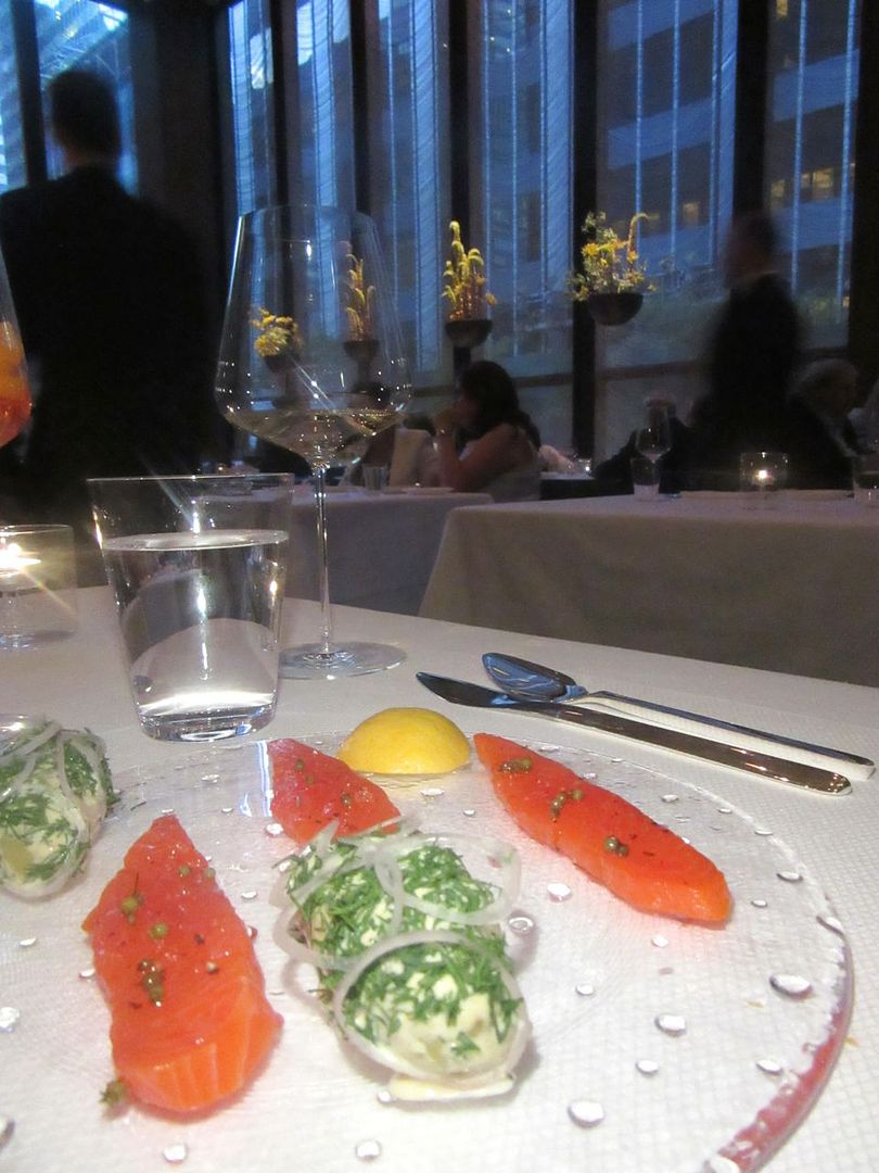 Nor am I nuts about the illuminated arrangements of plants that hang in front of the majestic rippling landmark metal curtains. Whatever they are. Eremurus, Zalaznick tells me. Supposed to evoke coral. Looks like cactus to me. I’m more impressed with the heavy linen cloth, the butter with salmon tartare on top in carved crystal with mother-of-pearl paddles, those delicious rolls, alas, too delicious. Why did we ask for more?