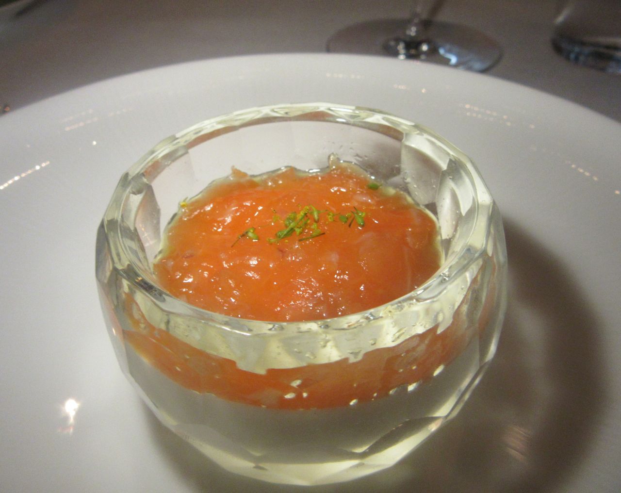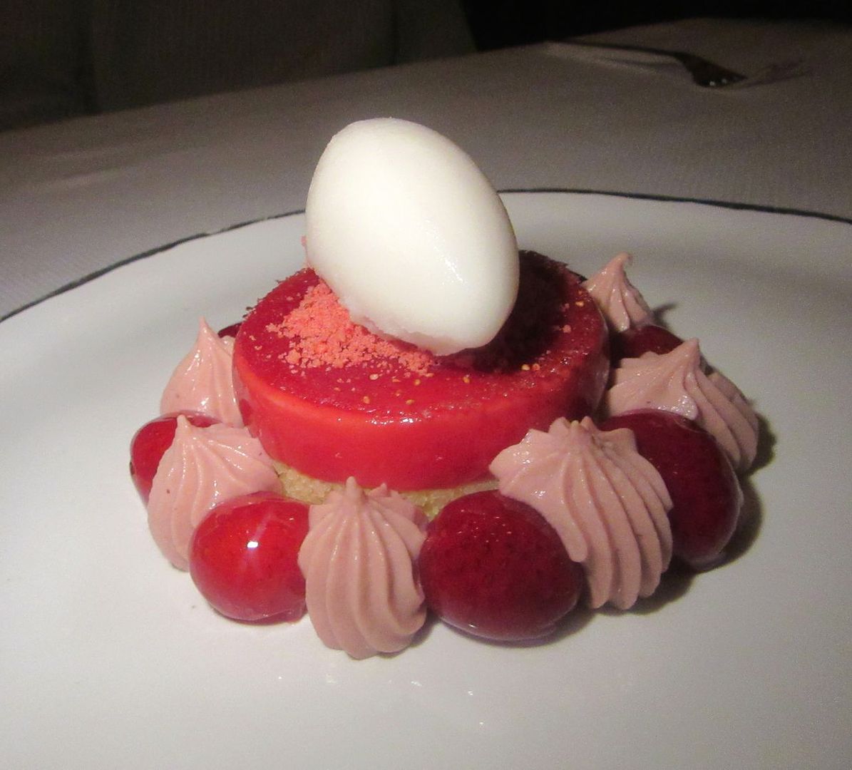 My niece and I share two small yellowfin tuna toasts. The chilled gazpacho salad with lemon cucumbers, grape tomatoes, Tristar strawberries and sea beans strikes my friend Marcia as a perfect starter. (It’s okay but I’d rather have a spicy gazpacho soup, myself.) Her husband seems to enjoy tuna carpaccio with artichoke relish. I’m sharing Marcia’s $74 Meyer lemon meunière glazed Dover sole — too thin and a tad overcooked, overwhelmed by its saucing. Unlike the monkfish with hearts of palm in an ocean emulsion. That’s heavenly.
