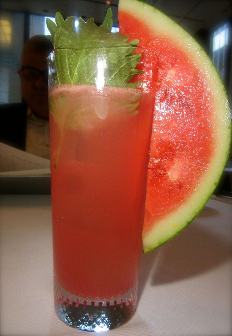 The watermelon attached to this rum cocktail is so perfect, my friend assumes it is fake.