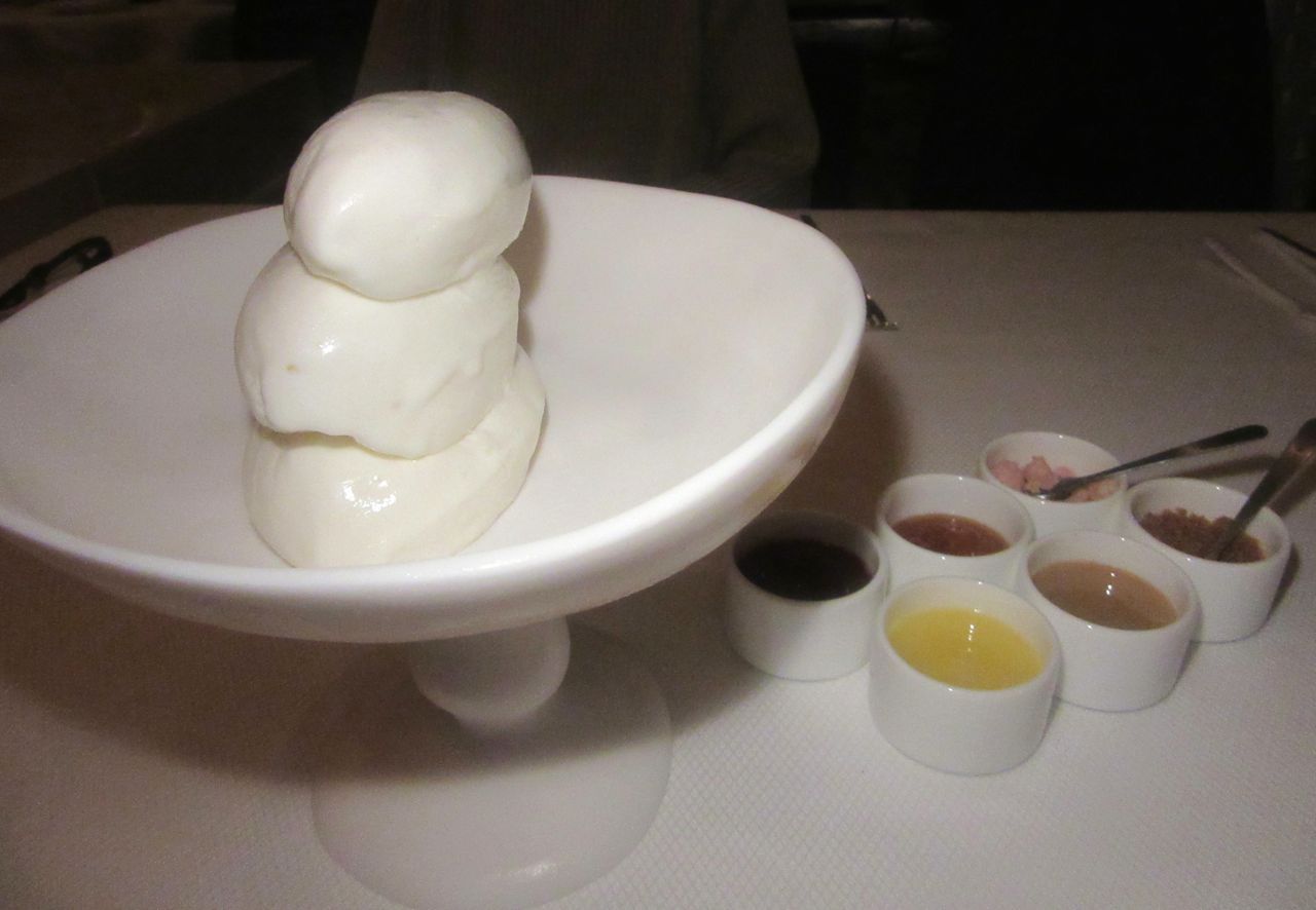 The Meyer lemon meringue with white sesame and fromage blanc by Manresa veteran Stephanie Prida seems small for an $18 dessert. Her strawberry shortcake with sweet corn and lychee is more shareable. But my favorite is the sweet, silken frozen yogurt — made to order — three scoops in a tall white china compote. It comes with “seasonal toppings” in small dishes, some of them highly exotic, like mandarinquat and plumcot as well as graham cracker crumbs, peach jam, candied strawberry caramel, yuzu citrus curd and chocolate crumbs.