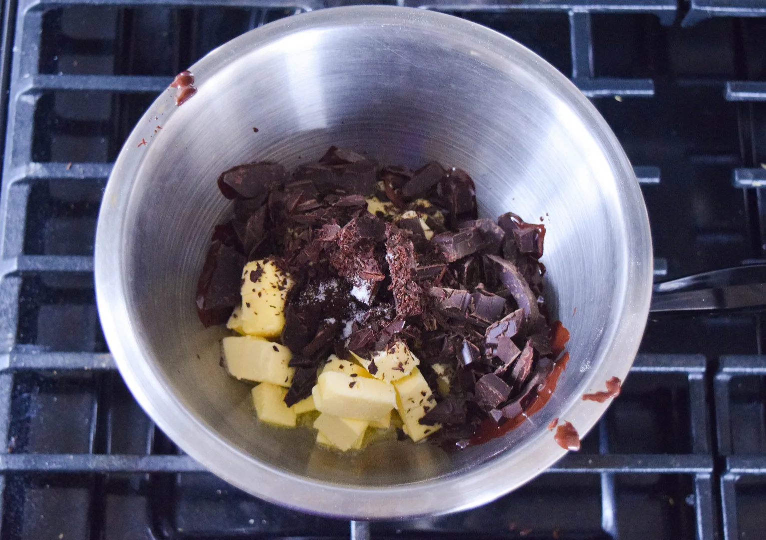 Melt the chocolate, butter, salt and coffee powder (if using) in a medium heatproof bowl set over a sauce pan of simmering water, stirring to combine. Once melted, set aside to cool.