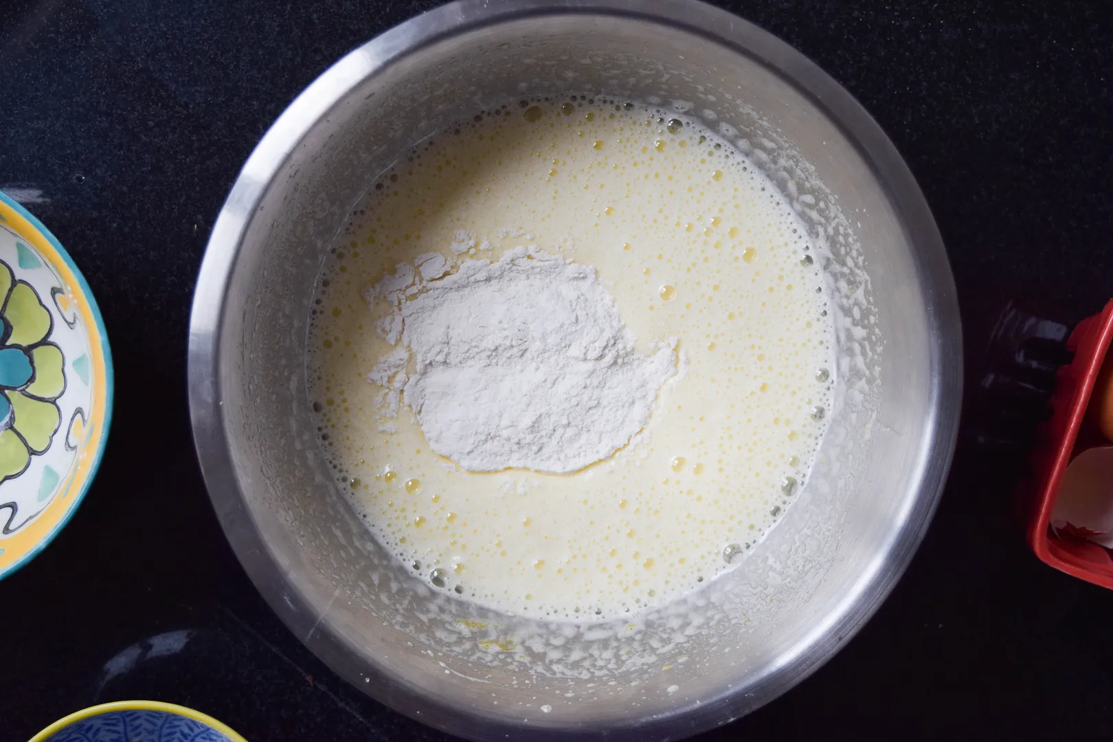 Add the flour to the egg and sugar, folding in with a spatula.