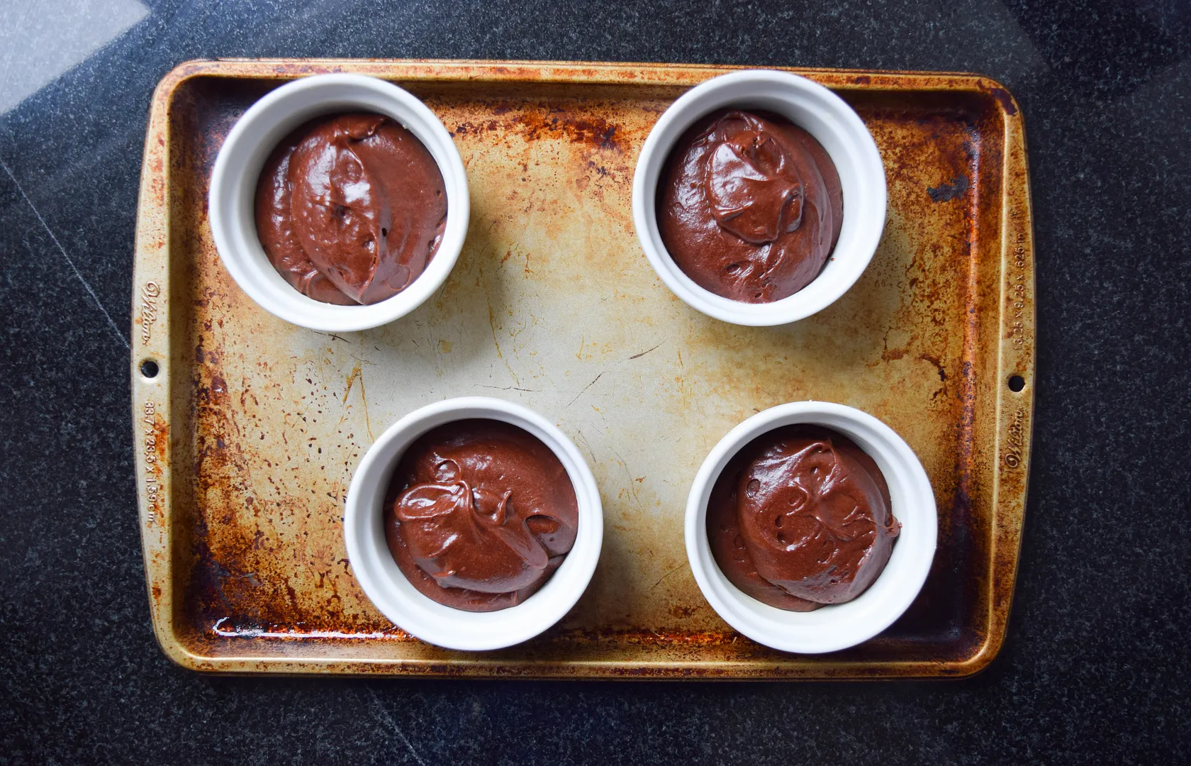 Place the batter into ramekins that have been greased with butter and their bottoms lined with circles of parchement. There will be enough batter to fill six small ramekins.